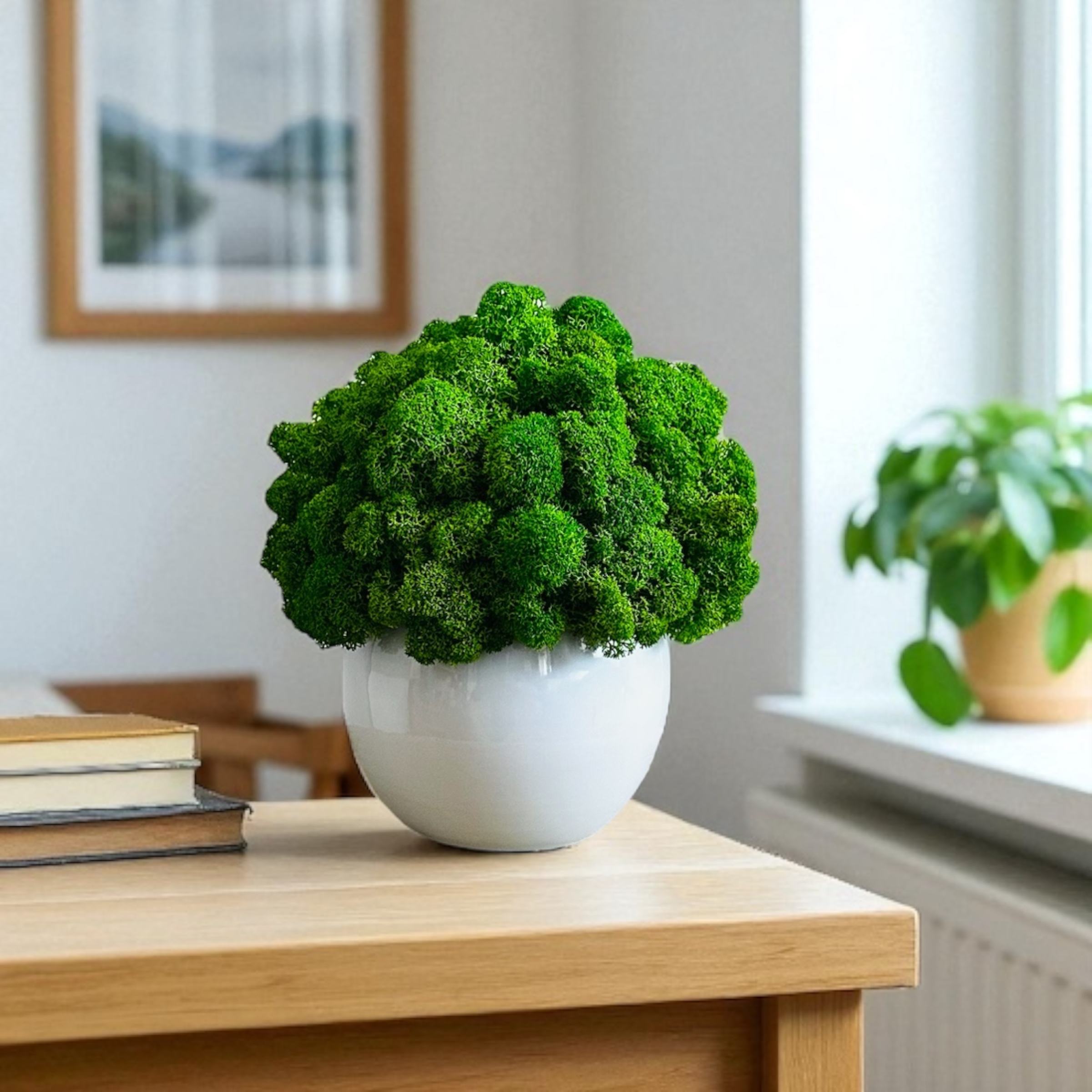 Elegancka doniczka z chrobotkiem stabilizowanym – dekoracja bez podlewania, która pięknie ozdobi dom, biuro lub gabinet. Zachowuje świeży wygląd przez lata.