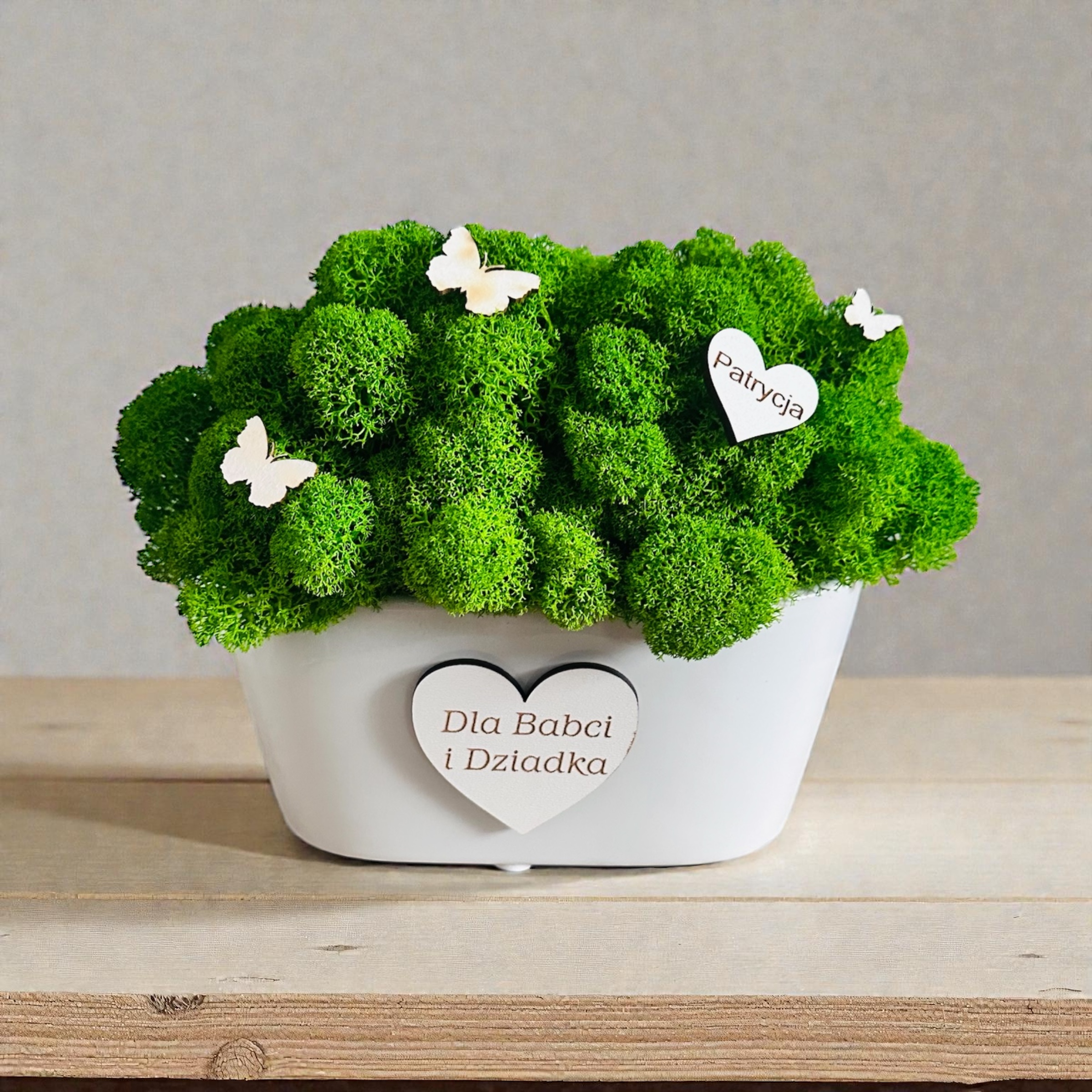 Elegancka doniczka z chrobotkiem stabilizowanym – dekoracja bez podlewania, która pięknie ozdobi dom, biuro lub gabinet. Zachowuje świeży wygląd przez lata. Możliwa personalizacja – idealne na prezent dla dziadków z okazji ich święta .