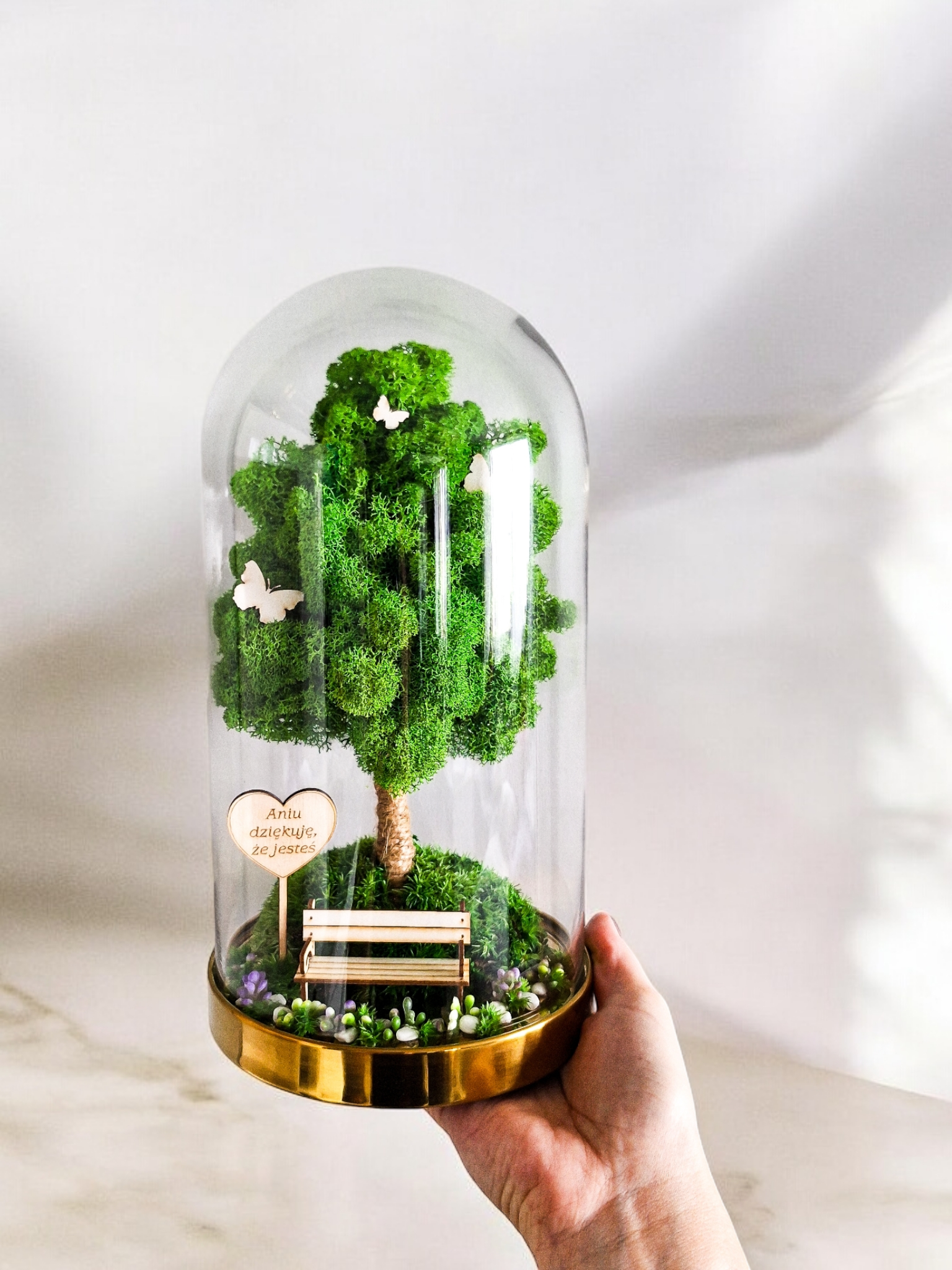Drzewko z chrobotka stabilizowanego zamknięte w szklanej kopule ze złotą podstawą to idealny wybór! Dzięki wysokości 27 cm doskonale prezentuje się na biurku, półce czy stole, harmonijnie wpisując się w nowoczesne, minimalistyczne oraz klasyczne aranżacje.