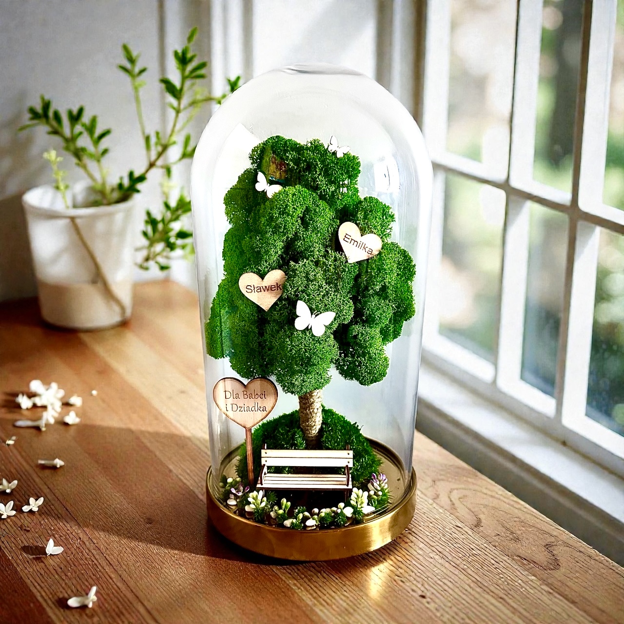 Każde drzewko tworzymy ręcznie, dbając o najdrobniejsze detale. Możesz dodać tabliczkę z indywidualnym napisem w kształcie serca lub prostokąta, a na koronie drzewa umieścić mini serduszka z imionami. To doskonały sposób na stworzenie niezapomnianego upominku pełnego emocji i osobistego charakteru.