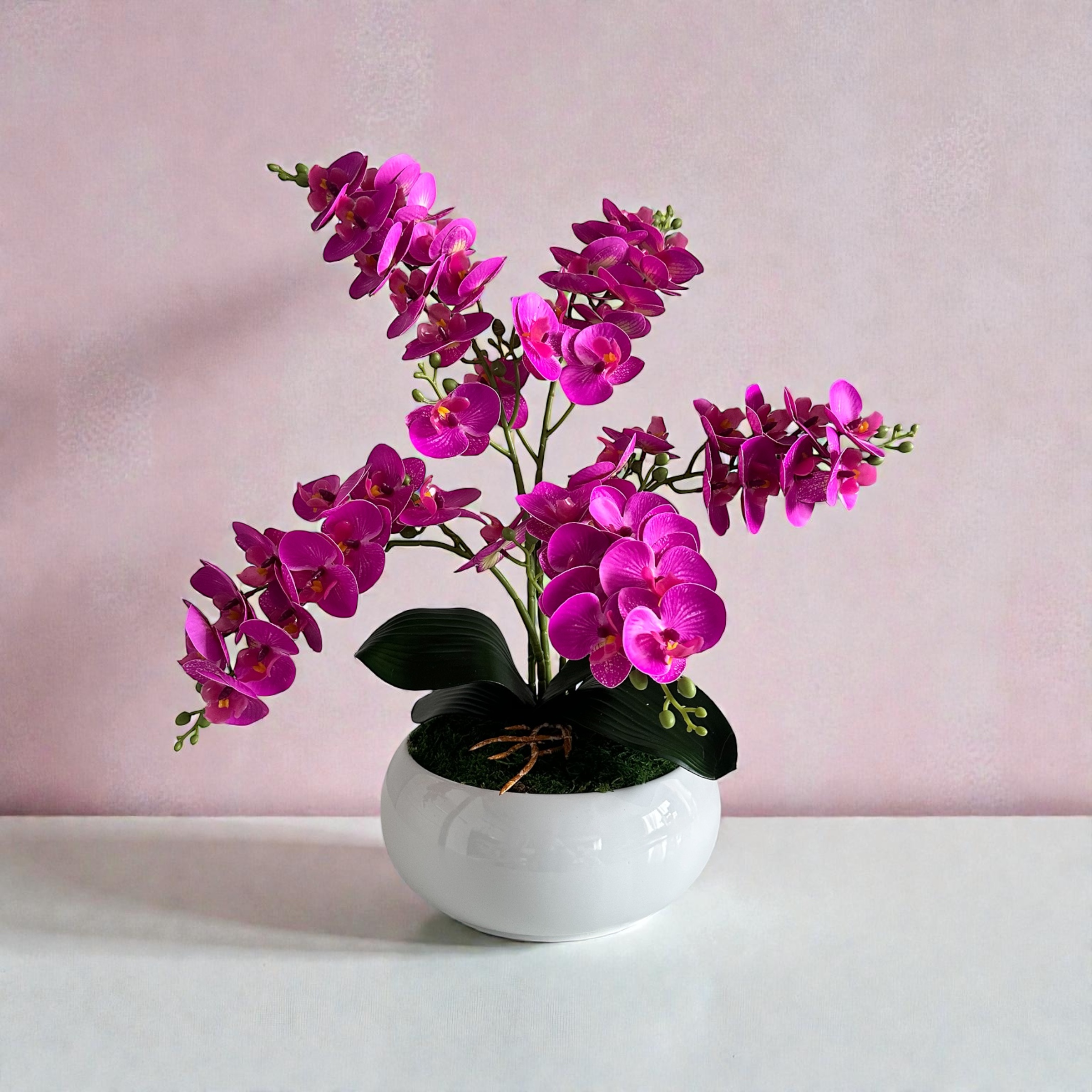Fioletowy storczyk symbolizuje luksus, kreatywność i wyjątkowość. Dzięki realistycznemu wykonaniu oraz dopracowanym detalom kompozycja prezentuje się niezwykle naturalnie. To doskonała alternatywa dla żywych roślin, szczególnie w miejscach, gdzie dostęp do światła jest ograniczony lub regularna pielęgnacja byłaby utrudniona.