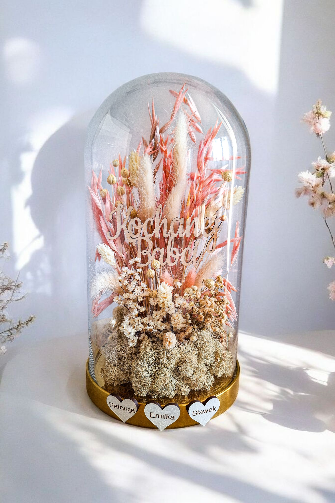 Elegancka kopuła szklana na złotej podstawie z kompozycją suszonych kwiatów i możliwością personalizacji napisu oraz imion wnuków. Ponadczasowy prezent na Dzień Babci i Dziadka, który wzrusza i zostaje na lata.