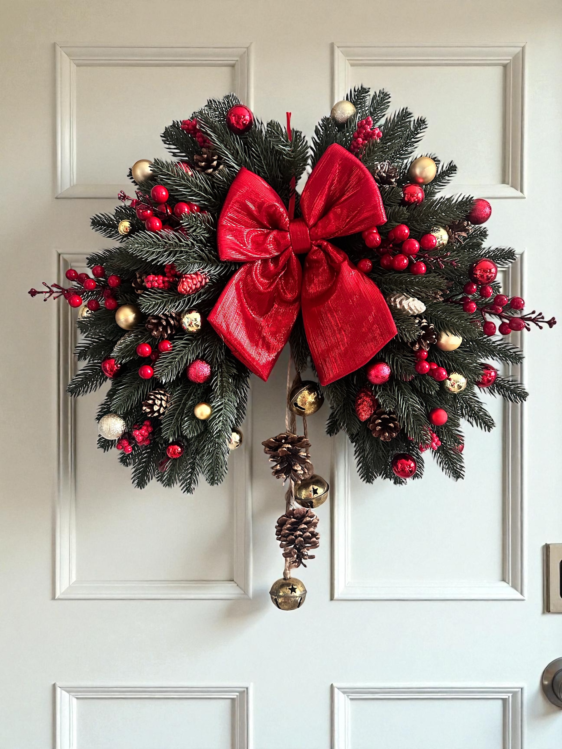 Wianek Świąteczny Luna (półwianek) 50 × 55 cm – czerwono-złoty z dzwonkami i dużą kokardą