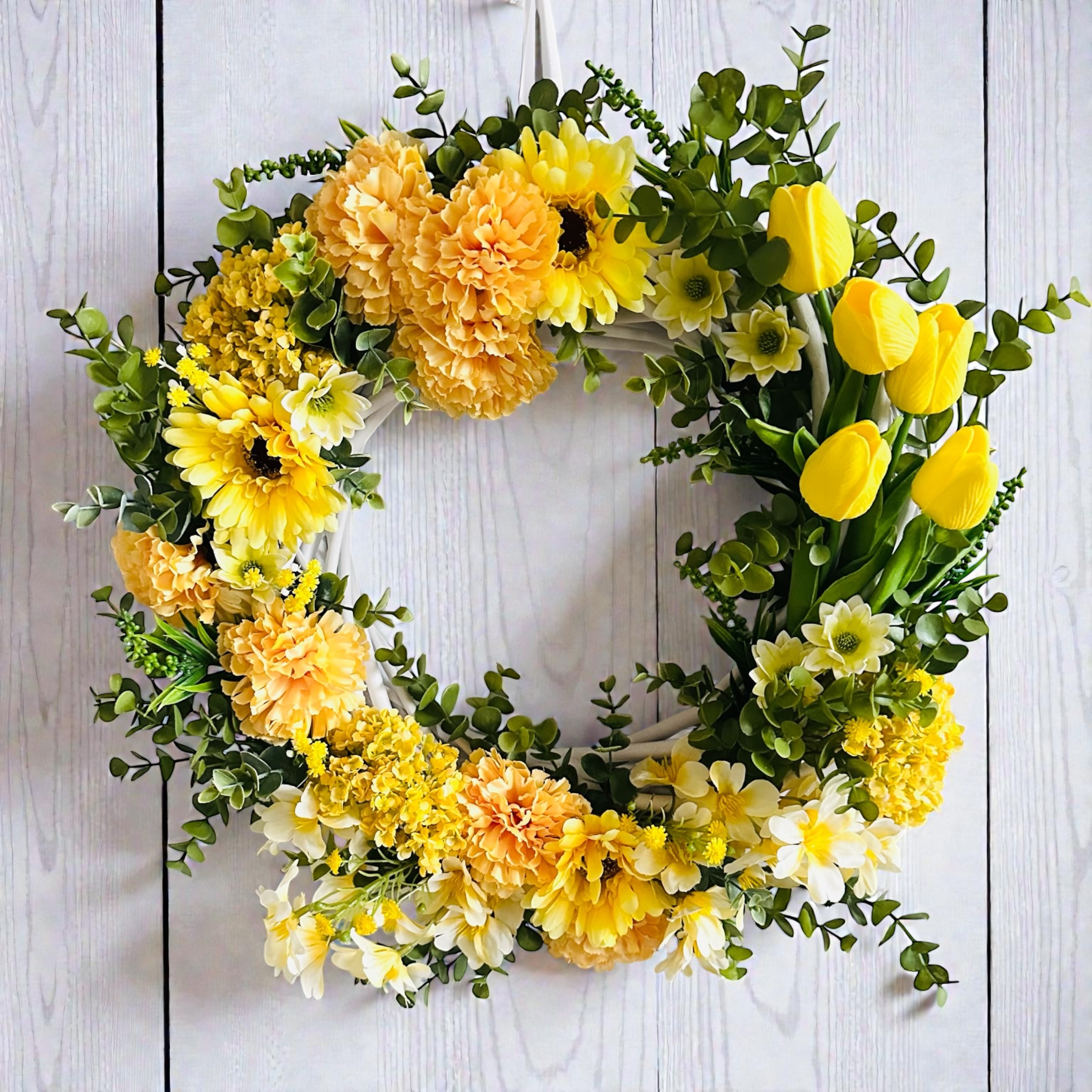Dominują tutaj słoneczne odcienie żółci – tulipany, pełne kwiaty w stylu goździków oraz drobne, delikatne akcenty florystyczne w połączeniu z soczystą zielenią liści. Całość tworzy harmonijną, świeżą kompozycję, która doskonale wpisuje się w klimat wiosny. To elegancki wianek na drzwi, który od razu przyciąga wzrok i wprowadza ciepłą atmosferę do domu.