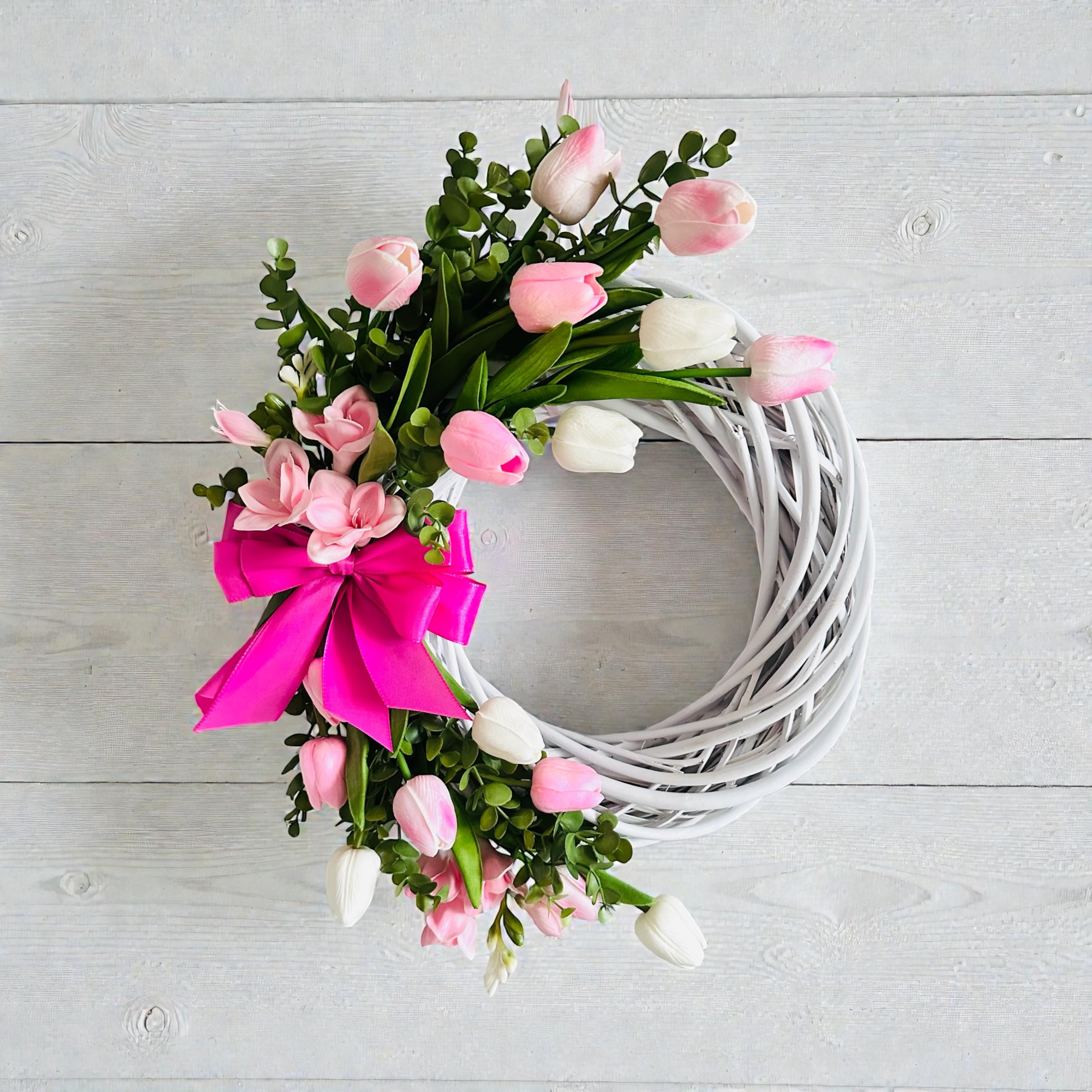 Wianek wiosenny  35 cm na białej wiklinie z tulipanami i frezjami premium. W Dostępny od ręki – 1 sztuka. Możliwość wykonania w innych kolorach.