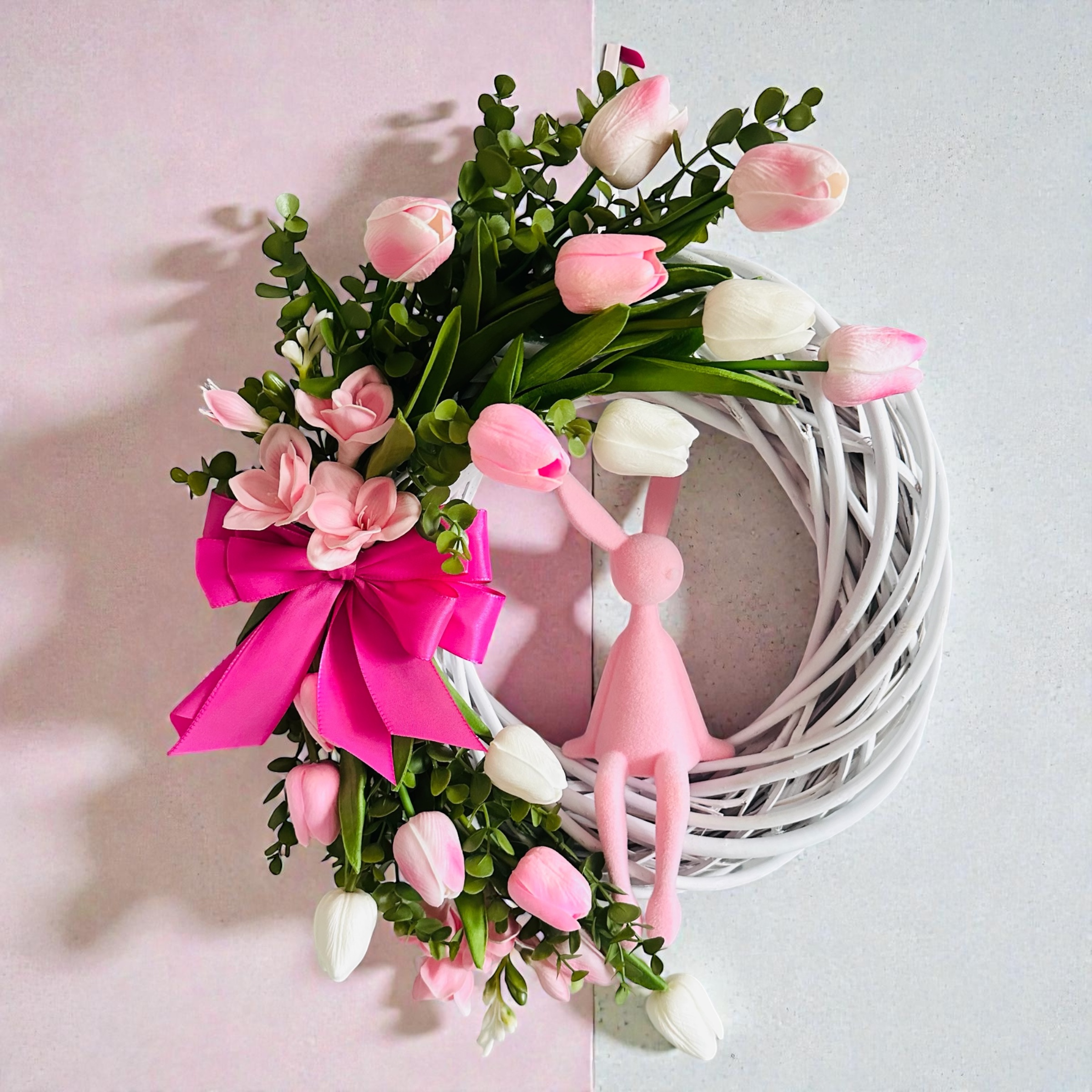 Wianek  został udekorowany wysokiej jakości kwiatami sztucznymi – tulipanami i frezjami wykonanymi z trwałej pianki. To produkt premium, który do złudzenia przypomina żywe kwiaty, a jednocześnie nie wymaga żadnej pielęgnacji. Delikatne odcienie różu i bieli w połączeniu z zielenią liści tworzą romantyczną, wiosenną kompozycję idealną na dekorację na drzwi lub jako ozdobę do salonu.