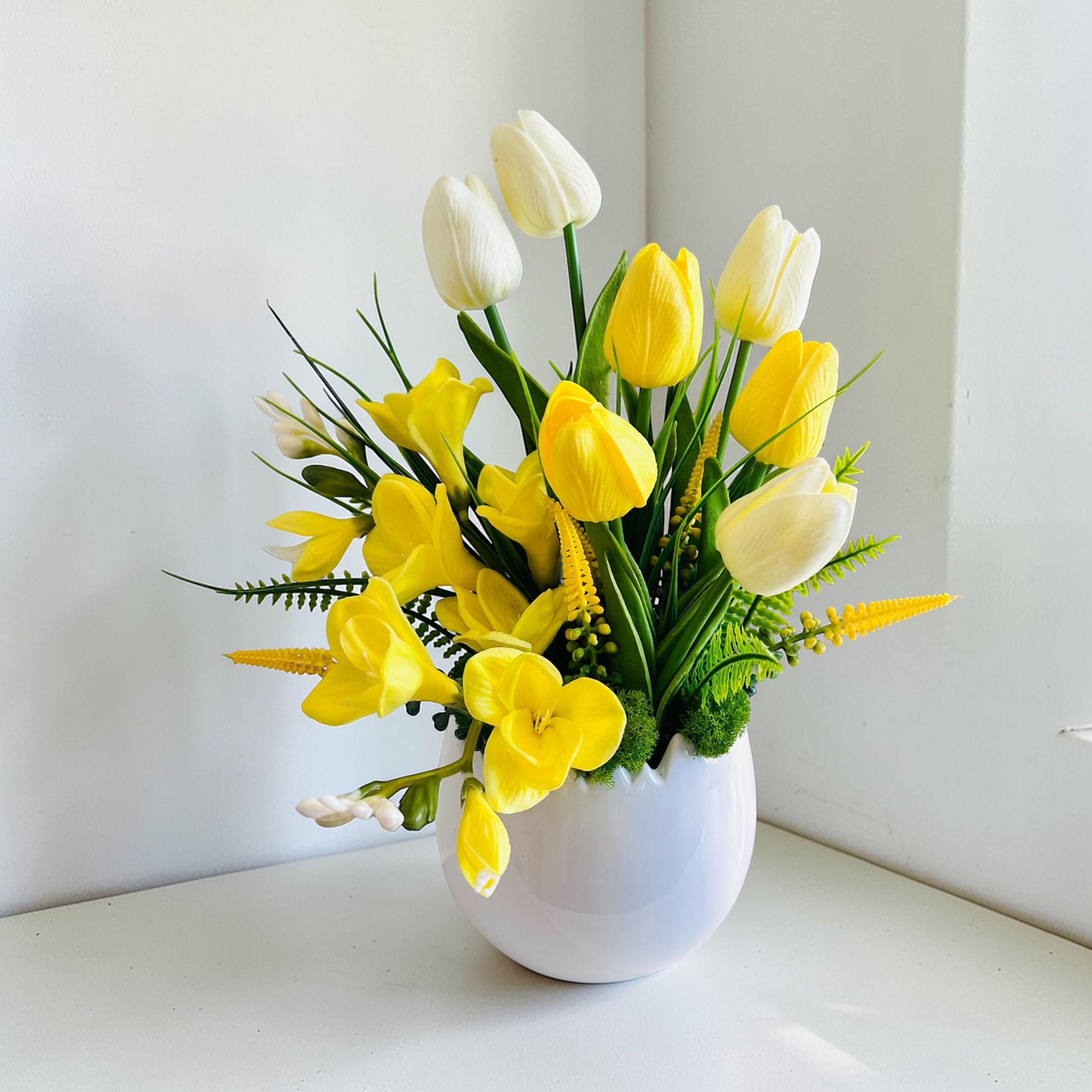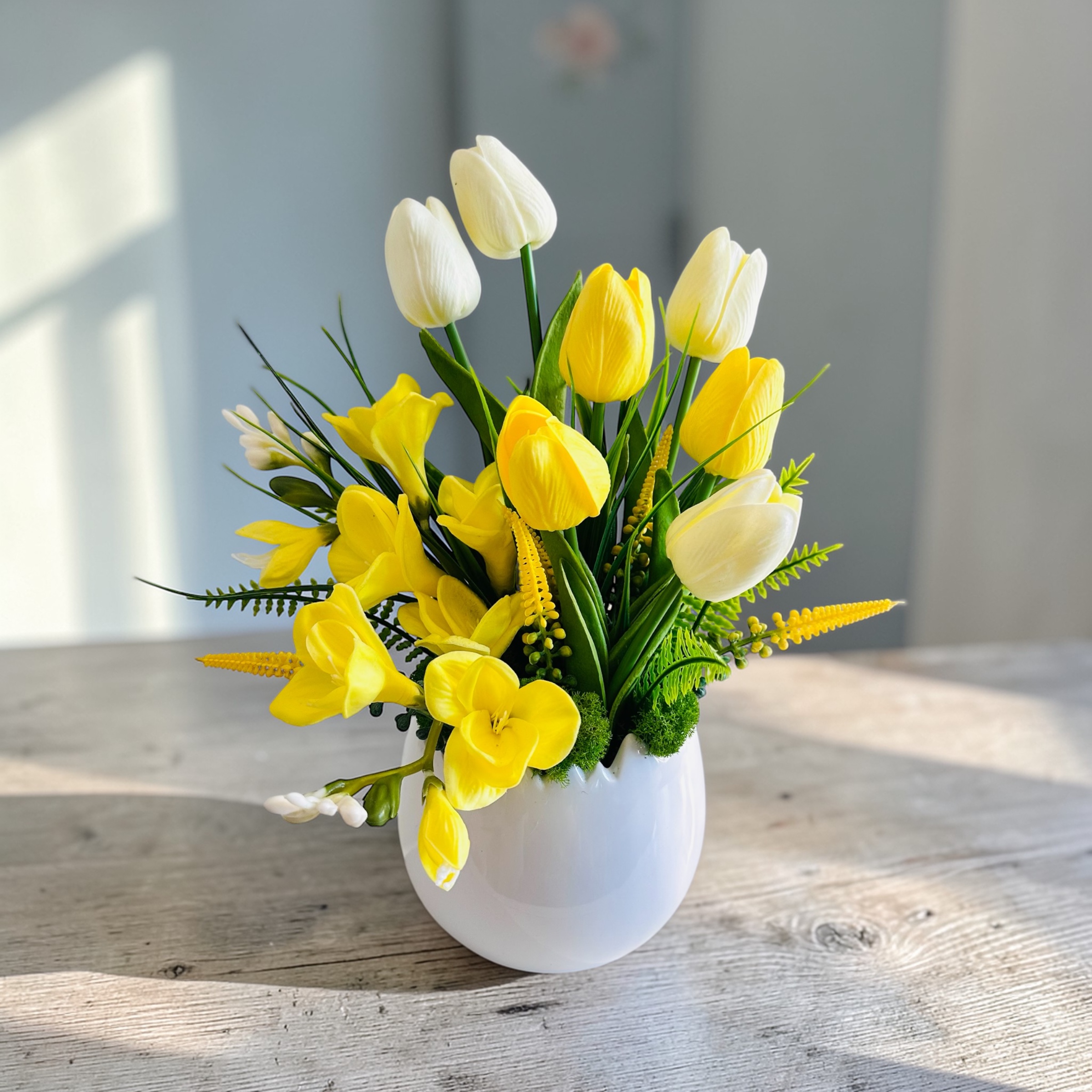 Elegancka dekoracja wiosenna w białej ceramicznej doniczce z kompozycją kwiatów sztucznych premium:  tulipany i frezje  piankowe.